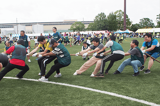 トヨタ車体グループの運動会に毎年たくさんの従業員が参加し、気持ちのよい汗を流します。